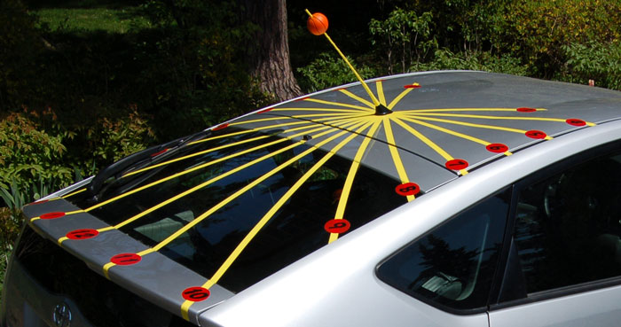 The antenna of my Prius exits the roof at a 48 degree angle, so how could I resist turning it into the gnomon for a"fast" sundial? The dial is configured for 48 degrees, but I live at 44.5 degrees, so for it to work I need to park facing south on a 3.5 degree incline. The nodus is a foam basketball, and is really just to make the car easier to find in a large parking lot, as there are no declination lines for it to mark. Antennas like these are now common on many cars, and easily unscrew for taking the car through a carwash.