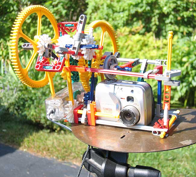 To film the 80 minute time lapse movie of the Odyssey of Light (see Consult Page), I built this automated device from my son's Kinex set. It took a photo every 20 seconds, and to my relief, worked flawlessly! Here is a 8 second movie of it running (Kinex Movie, 2.8 megabytes). |