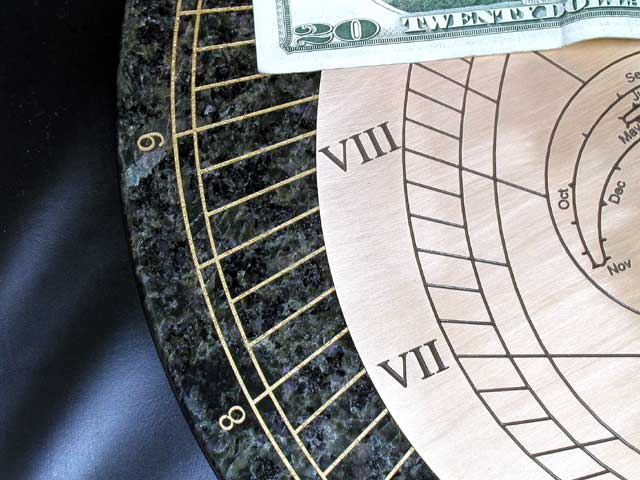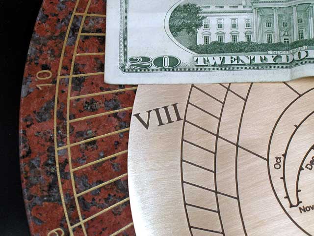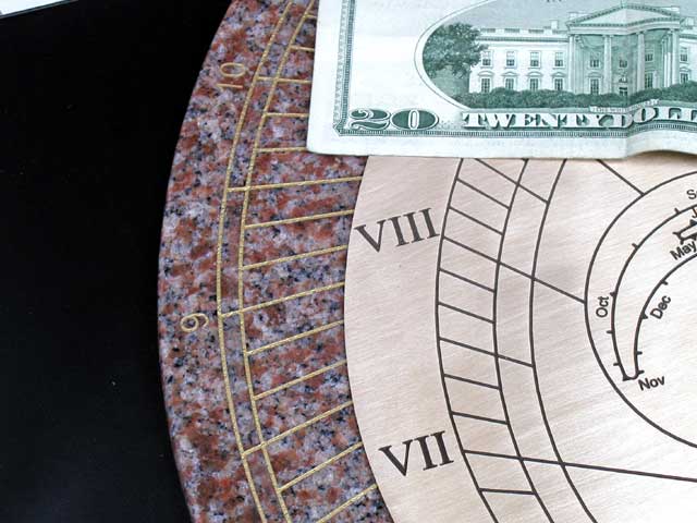 Sawyer Equant: $[discontinued]. It can be installed at any location from 23 to 51 degrees Latitude (Northern Hemisphere only), covering the 48 contiguous United States, much of Europe, and some of Canada and Mexico. This means that unlike most precision dials, if you move you can take it with you. Presently there is no model for latitudes outside this window, nor for the Southern Hemisphere, but will consider adding one if there is sufficient interest. Choice of granite color varies with availability, and is currently available in African Red, Laurencian green, and Vermillion pink. Its silicon bronze alloy (CDA65500) is commonly used in high quality outdoor sculpture and in marine applications and should endure beautifully for many, many years. It is not lacquered, so as to allow natural darkening due to exposure. All graphics are permanently etched into the surface of the bronze, and permanently sandblasted into the granite, followed by paint-filling. Download Owner's Manual (Sawyer Guide.doc)
