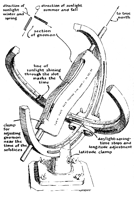 "These inducements led me to design a sundial last year which has become a continuing source of pleasure both to me and to my neighbors. With only a few simple settings during two seasons of the year the sundial can be made to indicate accurate clock time. It can be adjusted to the latitude and longitude of any point in the Northern Hemisphere, including those areas where clocks are changed for daylight-saving time. Clock time can be read from it to an accuracy of about one minute, even when the sky is covered by a light overcast. "Most people find sundials attractive, so one must not altogether dismiss their ornamental properties The structure of my dial was derived from the armillary, a traditional form which continues to enjoy wide popularity. Those primarily concerned with the appearance of a sundial admire the geometric perfection of the armillary's nested rings, representing latitude, longitude, tropics, celestial equator and the ecliptic. Much the same pleasing quality is found, however, in the unsymmetrical crescent of the early and late moon. The armillary can be converted to this form by eliminating all except the rings representing latitude and longitude and opening these at one of the sides where they join at right angles. When tapered and strengthened, these rings become nested crescents, as shown in the accompanying illustration [Figure 3]. "The transformation from armillary to nested crescents demonstrates how a pleasing shape can emerge from a functional necessity. A good time-telling device should always fulfill its mission. The armillary falls short of this ideal. During part of each day its pattern of ornamental rings casts shadows on the time-scale, which is carried on the inner face of the equatorial ring. Worse, in the seasons of the equinoxes (March 21 and September 28) the scale lies in continuous shadow because the plane of the ring then parallels the sun's rays. By eliminating the useless rings and opening the functional pair into crescents the time-scale is exposed to the sun without obstruction.