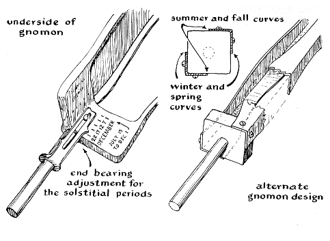 "The structure of a sundial which indicates clock time is simple in concept if not in the making. The crescents are supported at their edges by an arrangement of bolts, slots and clamps so they can be rotated in their respective planes. The latitude crescent is made in two parts with a flange at the inner end of each. Bolts pass through the flanges and through a slot in the longitude crescent. When the nuts are tightened, the assembly becomes a rigid unit. Similarly, the edge of one member of the latitude crescent is clamped between the jaws of a split pedestal which extends up from the base. By loosening a single wing-nut the whole assembly can be rotated in the plane of the latitude crescent and in azimuth. "A pair of holes are drilled in the latitude crescent on the diameter which coincides with the axis oŁ the equatorial crescent. These holes serve as bearings to support the gnomon. It is to the unique shape of the gnomon, which compensates for the effect of the eccentricity of the earth's elliptical orbit and the tilt of its axis, that this sundial owes its property of keeping clock time. If the earth followed a circular orbit around the sun, and if its axis were perpendicular to the plane of the ecliptic, the straight gnomon of the conventional sundial would indicate clock time. The time shown by clocks is that of a fictional sun which leads the real sun by as much as 16 minutes or lags behind it up to 14 minutes, depending upon the observer's location and the season. This difference is known as the equation of time and is shown graphically as the analemma on globes, a closed curve in the form of a figure eight. "The gnomon of my dial is related to the analemma but differs from it in that halves of the figure are separated and the ends have been stretched somewhat. Structurally the gnomon consists of a strip of cast metal bent at a right angle along its length. The apex of the angle is opened to form a thin slot. It is supported at the ends by shafts which turn in the bearings of the latitude crescent. The halves of the gnomon are bent into almost symmetrical compound curves with respect to the long axis and are therefore complementary. When either half is turned to face the sun, the curved ribbon of light which passes through the slot corresponds with the equation of time for half of the year, the remaining six months being represented by the other half. Time is indicated by the thin line of light, from the slot which falls on the time-scale between shadows cast by the halves of the gnomon. "The portion of the curved slot through which the rays pass to the time-scale depends on the declination of the sun. In summer, sunlight falls on the dial at a high angle and reaches the time-scale through the upper part of the slot, where the curvature just compensates for a 'slow' sun. The reverse is true in the fall, when the sun is low. The winter sun is also mostly slow, and in the spring the sun goes from slow to fast to slow to fast again. Whatever the season, the sun's declination selects an appropriate portion of the curve to offset the equation of time. "Some difficulty is encountered during the period from about December 1 through January 15, when the sun lingers close to its lowest path across the sky. During this same period, however, it speeds up with respect to the fictional sun. A lag of some 11 minutes becomes a lead of about nine minutes. The simultaneous change in declination is very small. A similar event takes place in reverse during the weeks preceding and following the summer solstice on June 21, when the real sun falls behind the fictional one, again accompanied by little change in declination. To accentuate the sundial's response during these periods, the curvature of the slot is stretched out. The gnomon must also be moved axially in its bearings, the amount of shift being determined by a stop on the shaft. The adjustment is made by hand according to a scale of dates engraved on the gnomon, as shown in the accompanying detail drawing [Figure 4]. "The designing of the gnomon' though tedious, is not difficult. One first determines the rate at which a ray of sunlight moves across the time-scale. This depends on the diameter of the crescent on which the scale is engraved and on the related distance between the scale and the gnomon. Multiply 3.1416 by the diameter of the equatorial crescent and divide the product by the number of seconds in a day. In the case of a 13-inch crescent the result is .000473. This number is used for computing the distance and direction by which the curved slot must depart from a straight line for successive weeks of the year. This procedure can be illustrated by constructing a graph of the curve for one face of gnomon. First draw a straight line equal to the radius of the proposed crescent and erect a perpendicular of about the same length above and below one end of the line. The base line represents the sun's mean elevation (0 degrees) on September 28. Next, with the end of the base line as the point of origin, extend a line to the perpendicular at an angle of 21 degrees, 34 seconds above the base line. This represents the sun's elevation on July 15. Now make a similar angle of 21 degrees, 47 seconds below the base line. This corresponds to the sun's elevation on December 1. Angles above the base line are regarded as positive and are designated 'plus'; those below are considered negative. Next, draw in angles at weekly intervals for all intermediate dates. A table showing the sun's angular elevation throughout the year can be found in any ephemeris and in many almanacs. These references also carry a table for the equation of time and list the difference between solar time and clock time in minutes and seconds. The curve for one face of the gnomon is plotted from these values. (If the thickness of the material from which the gnomon is constructed exceeds .01 inch, the curvature of the trailing edges must depart from that of the faces to avoid sh