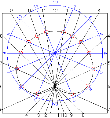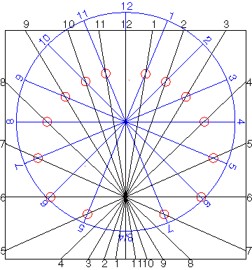 Here the two designs are overlapped. The intersection of matching hour lines are noted with red circles. At these points the design works both as a sundial and as equally spaced (blue) hour lines. |